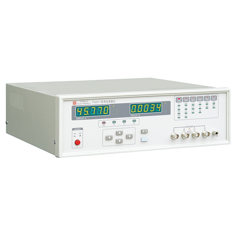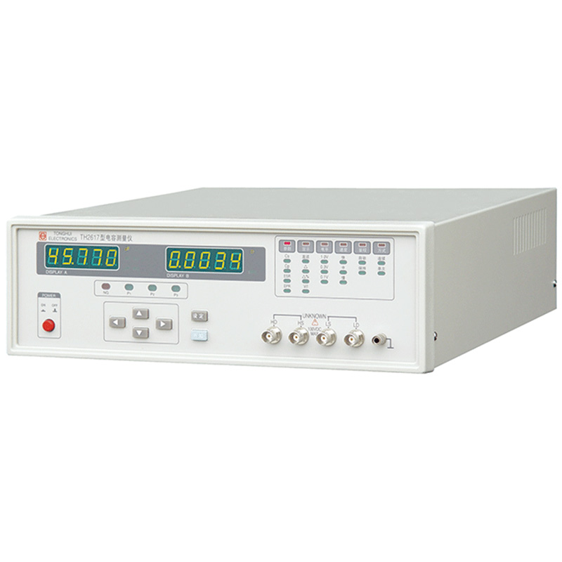 TH2617型電容測量儀是一種高精度、寬測試范圍的電容參數測量儀器,可方便選擇100 Hz、120 Hz、 1 kHz、10 kHz、40 kHz、100 kHz六個典型測試頻率, 并可選擇0.1 V、0.3 V、1.0 V三個測試信號電平。儀器既能適應生產現場高速檢驗的需要, 又能滿足實驗室高準確度高穩定度的測量需要, 同時儀器所提供的HANDLER及RS-232C接口為儀器使用于元件自動分選系統和與計算機聯網通訊提供了條件, 打印接口可直接將儀器測量條件輸出至打印機.